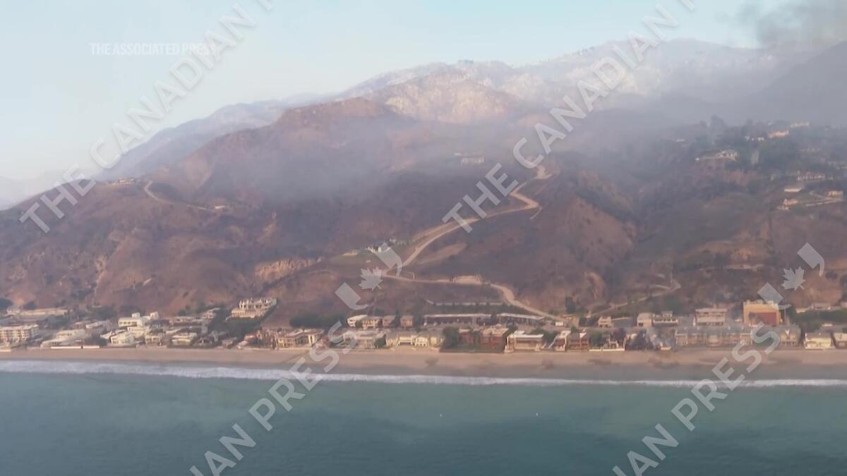 Aerial footage shows the devastating aftermath of wildfires that have swept through the Los Angeles area. The footage, captured by helicopter, highlights scorched landscapes and charred structures along LA's famed Pacific Coast Highway. (AP Video: Haven Daley)