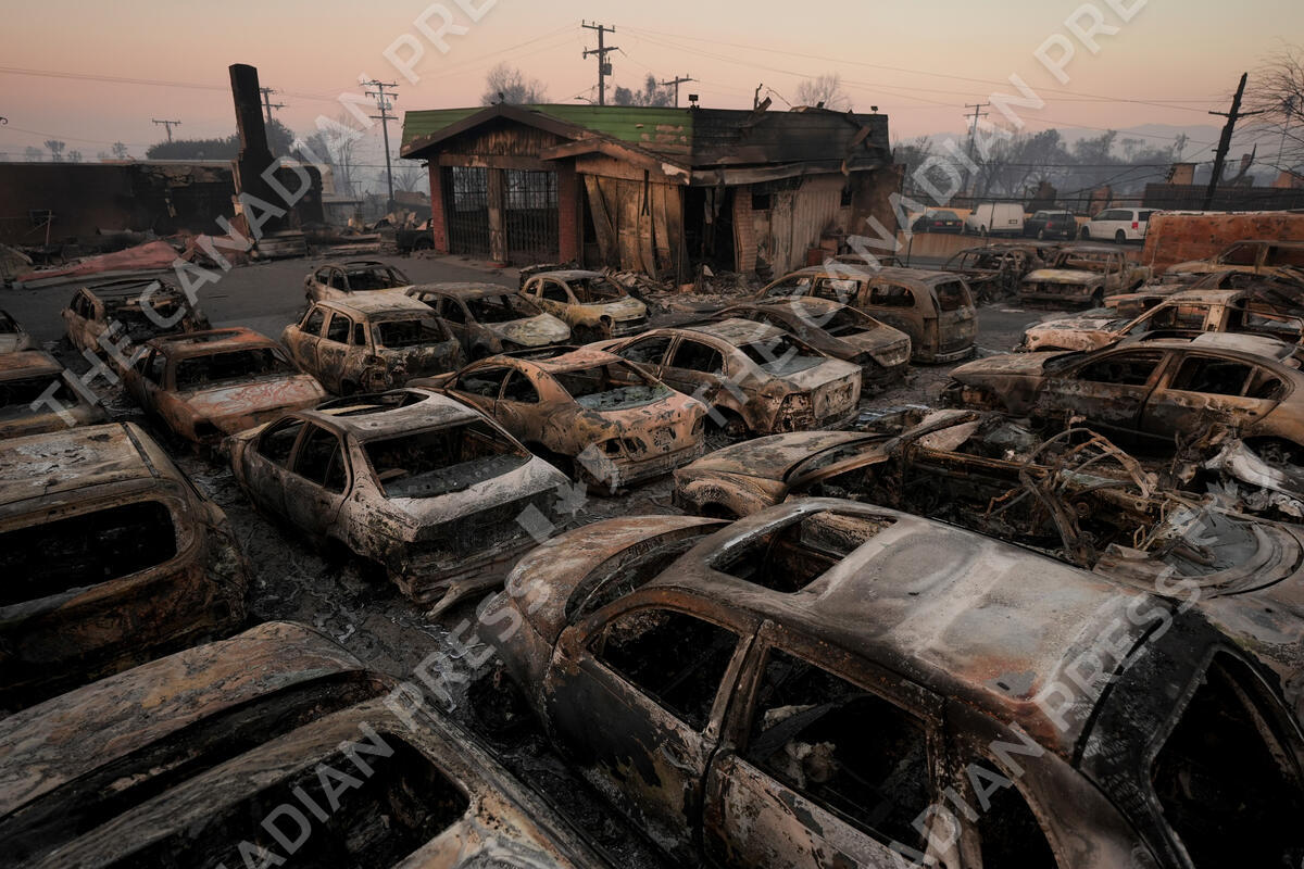 Cars are left charred inside a dealership in the aftermath of the Eaton Fire Friday, Jan. 10, 2025 in Altadena, Calif. (AP Photo/Jae C. Hong)