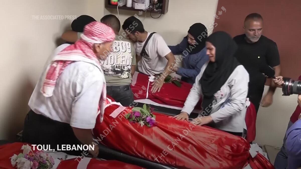 Relatives weep as Israeli strike in southern Lebanon kills several, including woman and her children