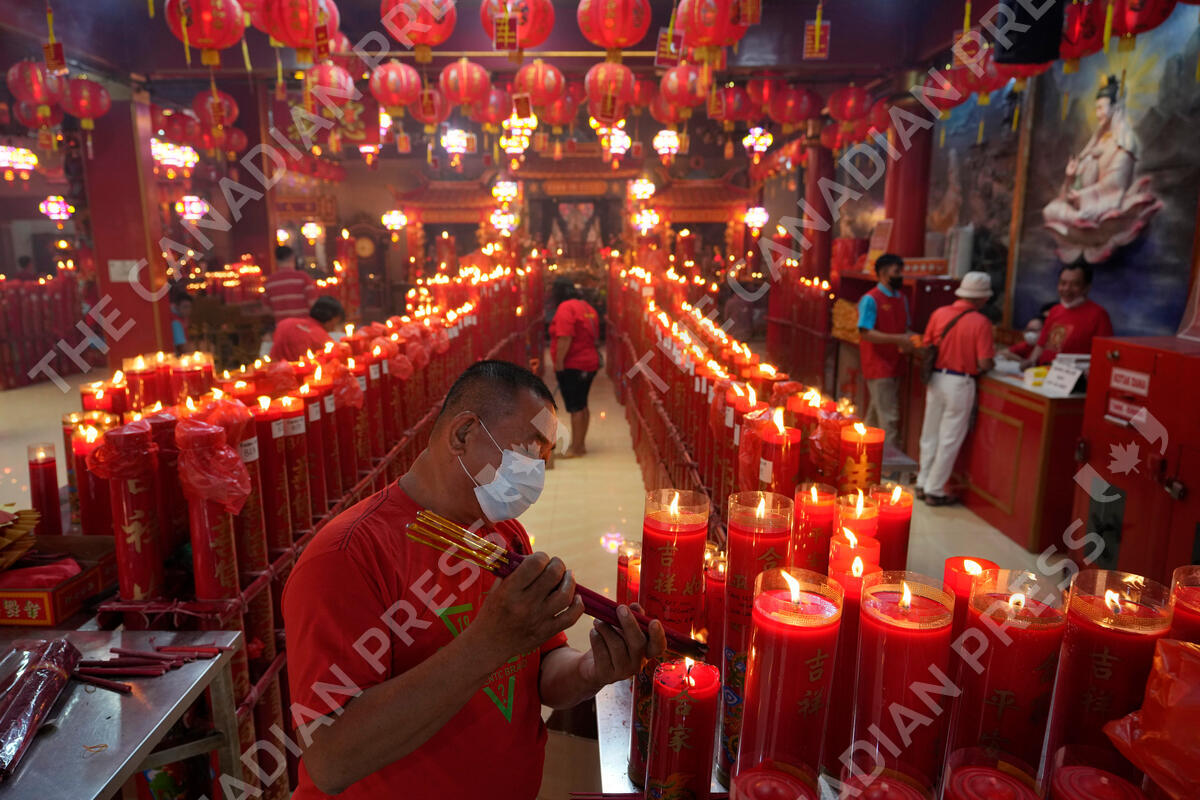 A man wearing a face mask burns his first joss sticks as he offers prayer at Hok Lay Kiong temple in Bekasi, Indonesia, Sunday, Jan. 22, 2023. The Lunar New Year which marks the Year of the Rabbit in the Chinese zodiac. (AP Photo/Achmad Ibrahim)