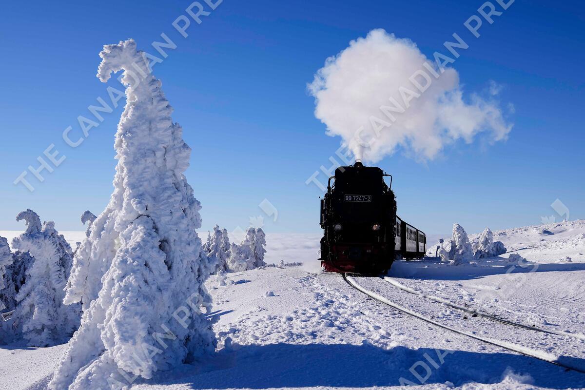 A steam train arrives the top of the 1,142-meter high (3,743 feet) snow covered Brocken at the Harz mountains near Schierke, Germany, Tuesday, Jan. 24, 2023. (AP Photo/Matthias Schrader)