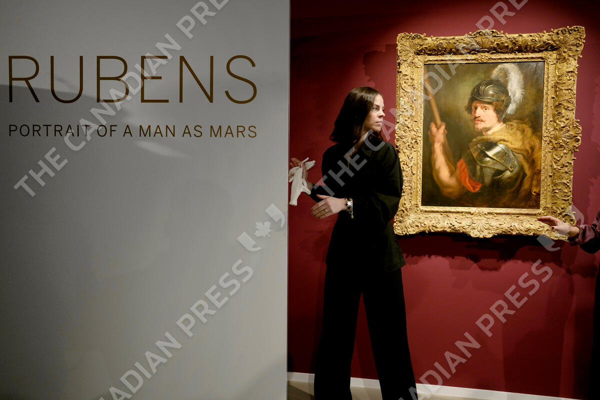 Portrait of a Man as the God Mars, by Flemish painter Sir Peter Paul Rubens, is unveiled at Sotheby's in Brussels, Tuesday, Feb. 21, 2023. (AP Photo/Virginia Mayo)