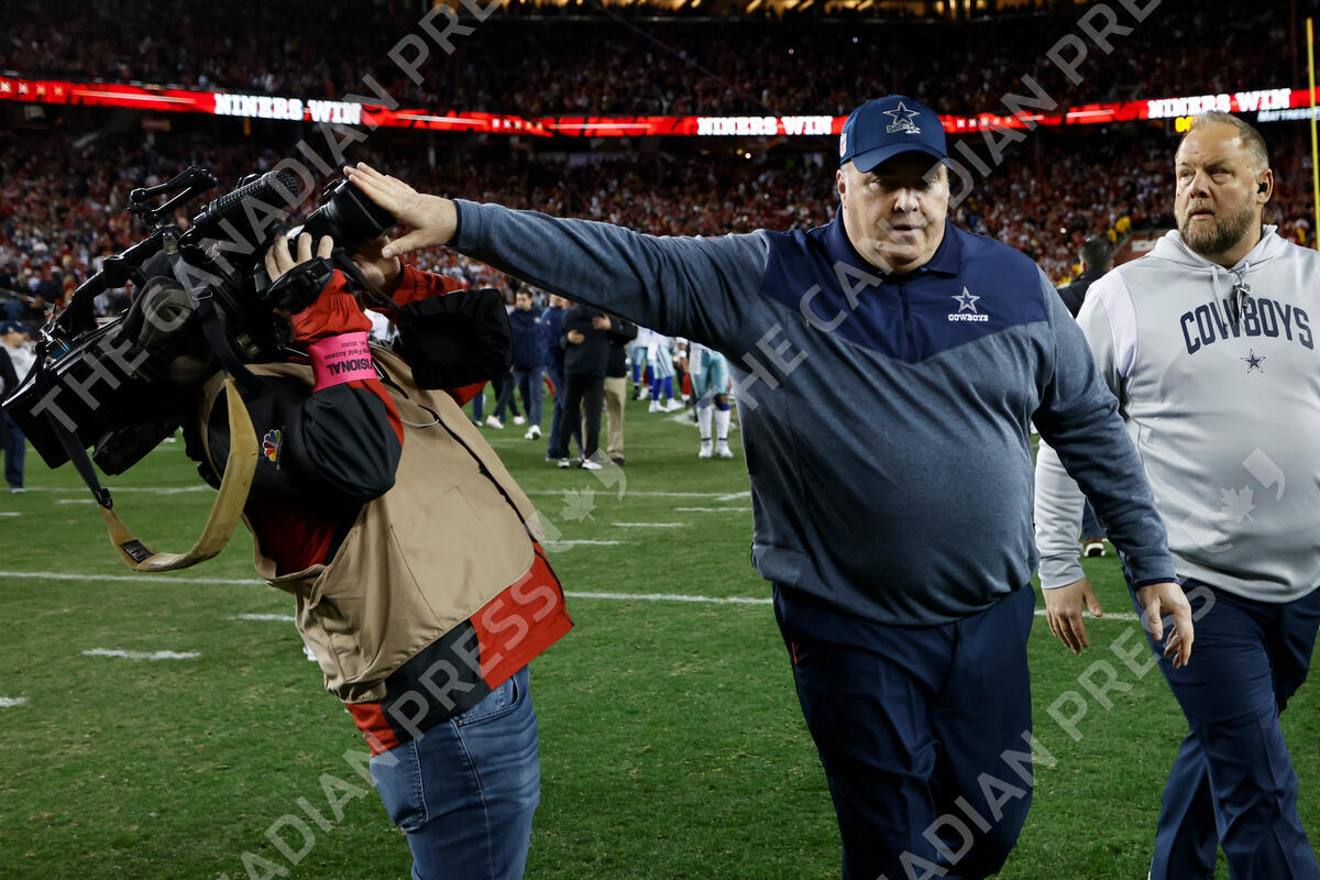 Dallas Cowboys head coach Mike McCarthy pushes a videographer away while walking off the field after an NFL divisional round playoff football game against the San Francisco 49ers in Santa Clara, Calif., Sunday, Jan. 22, 2023. (AP Photo/Josie Lepe)