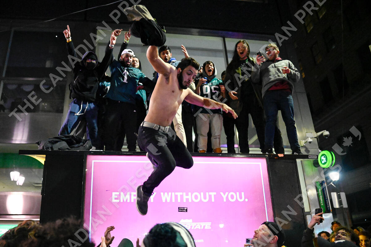 Philadelphia Eagles supporters react to the Super Bowl 57 NFL football game between the Kansas City Chiefs and the Eagles, Sunday, Feb. 12, 2023, in Philadelphia. The Chiefs won 38-35. (AP Photo/Joe Lamberti)