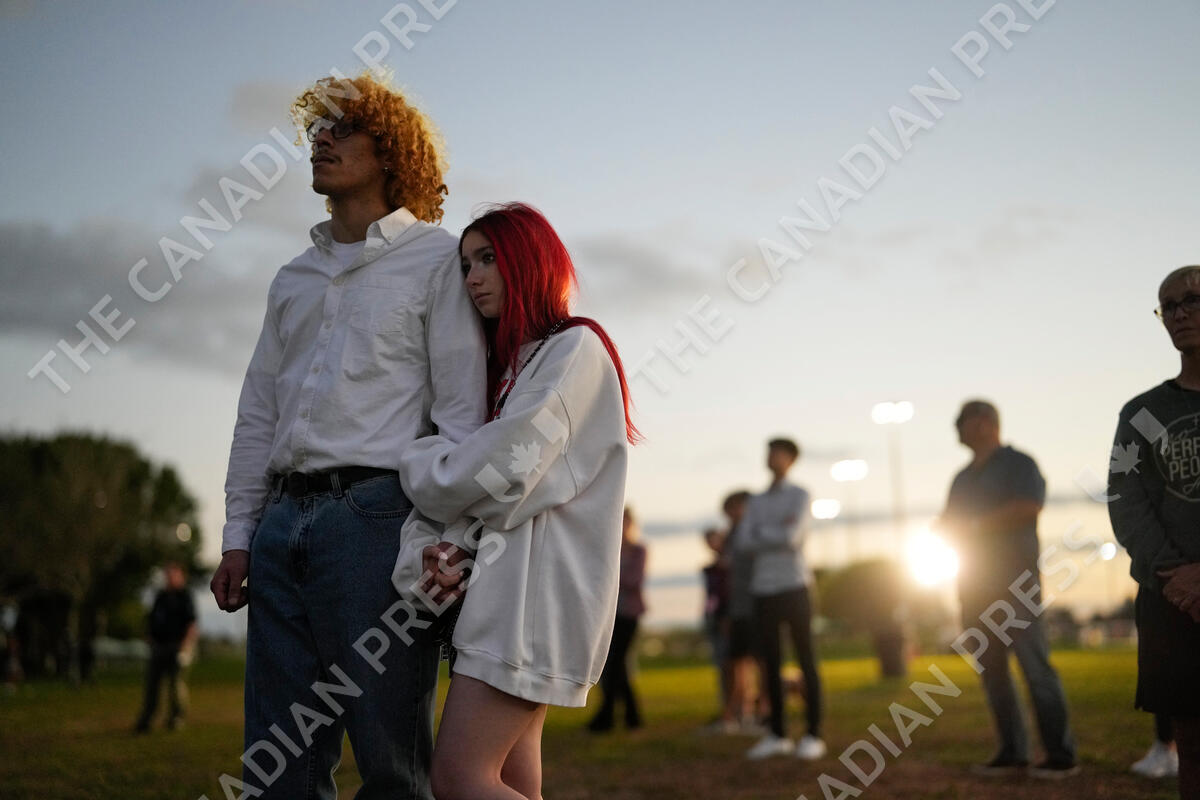 People listen to interfaith prayers during a community commemoration ceremony for the 17 students and staff of Marjory Stoneman Douglas High School who were killed at the Parkland, Fla., school, on the five-year anniversary of the shooting, Tuesday, Feb. 14, 2023, at Pine Trails Park in Parkland. (AP Photo/Rebecca Blackwell)