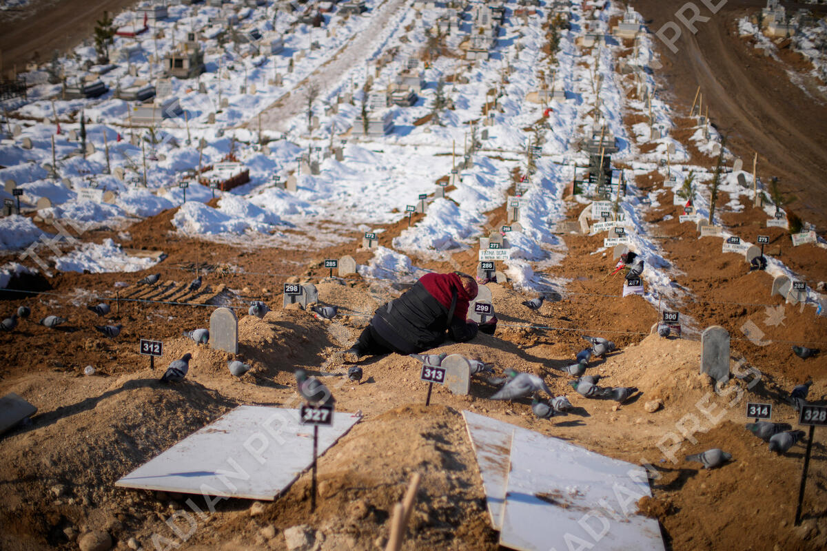 A woman cries over the graves of her son and daughter, killed during the earthquake at Sehir cemetery in Malatya, Turkey, Sunday, Feb. 12, 2023. Five days after two powerful earthquakes hours apart caused scores of buildings to collapse, killing thousands of people and leaving millions homeless, rescuers were still pulling unlikely survivors from the ruins. (AP Photo/Francisco Seco)