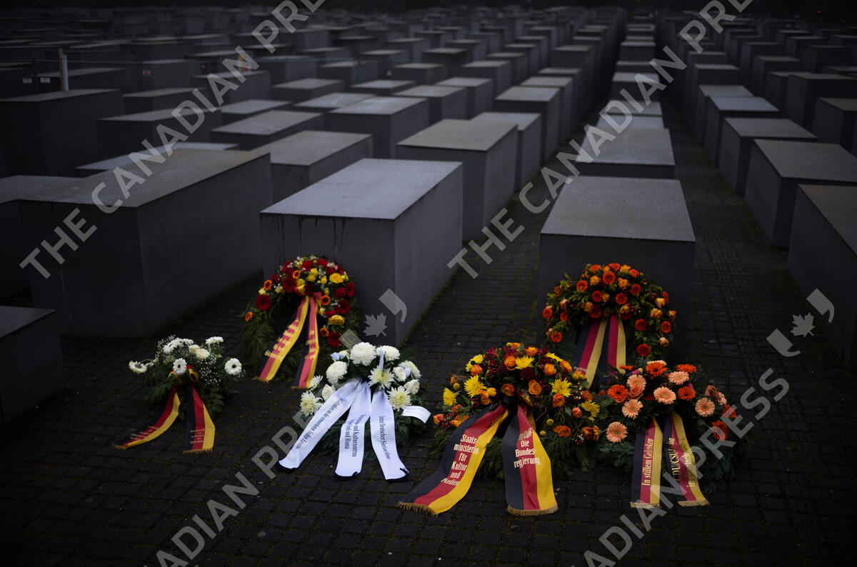 Wreaths are placed at the Memorial to the Murdered Jews of Europe on the International Holocaust Remembrance Day in Berlin, Germany, Friday, Jan. 27, 2023. (AP Photo/Markus Schreiber)