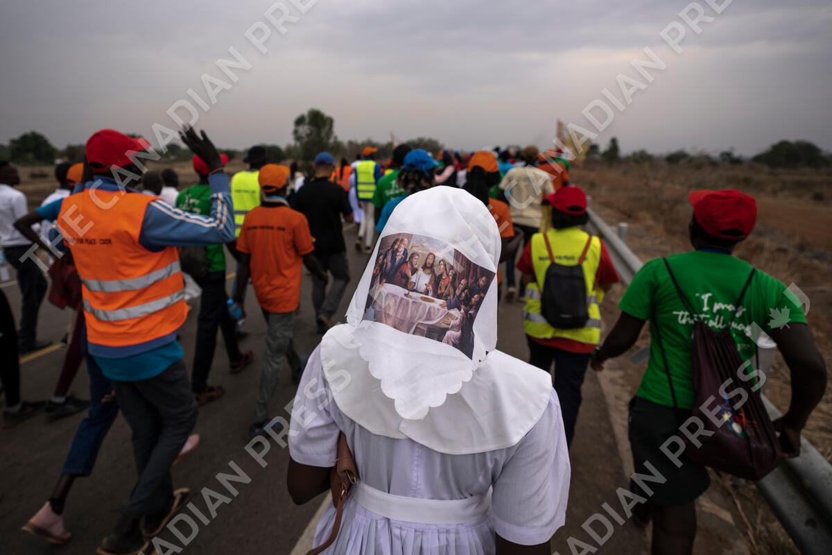 A sister wears headwear showing a picture of The Last Supper, as she and a group of the Catholic faithful from the town of Rumbek arrive after walking for more than a week to reach the capital for the visit of Pope Francis, in Juba, South Sudan Thursday, Feb. 2, 2023. Pope Francis is due to travel to South Sudan later this week on the second leg of a six-day trip that started in Congo, hoping to bring comfort and encouragement to two countries that have been riven by poverty, conflicts and what he calls a "colonialist mentality" that has exploited Africa for centuries. (AP Photo/Ben Curtis)