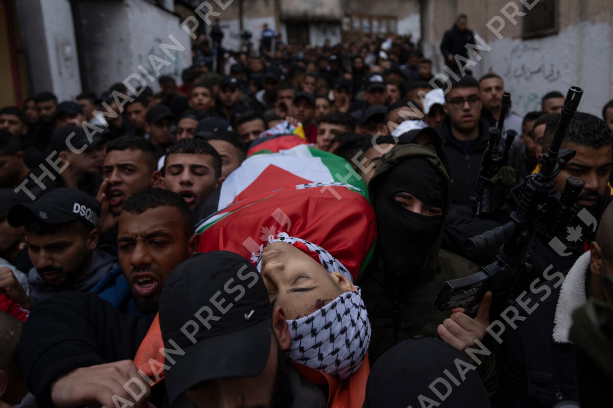 Mourners carry the body of Palestinian Amer Abu Zeitoun, 16, during his funeral in the West Bank refugee camp of Balata, Nablus, Thursday, Jan. 5, 2023. Abu Zeitoun was killed Thursday by Israeli fire during an arrest raid in the occupied West Bank city of Nablus on Thursday, the Palestinian Health Ministry said. (AP Photo/Nasser Nasser)