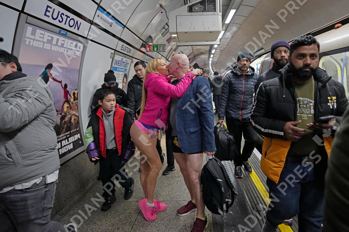 Participants kiss on a platform as they take part in the annual event "No Trousers Tube Ride" in London, Sunday, Jan. 8, 2023. The No Trousers Tube Ride returns to London, the first time the event had taken place since January 2020, due to COVID-19. (AP Photo/Kin Cheung)