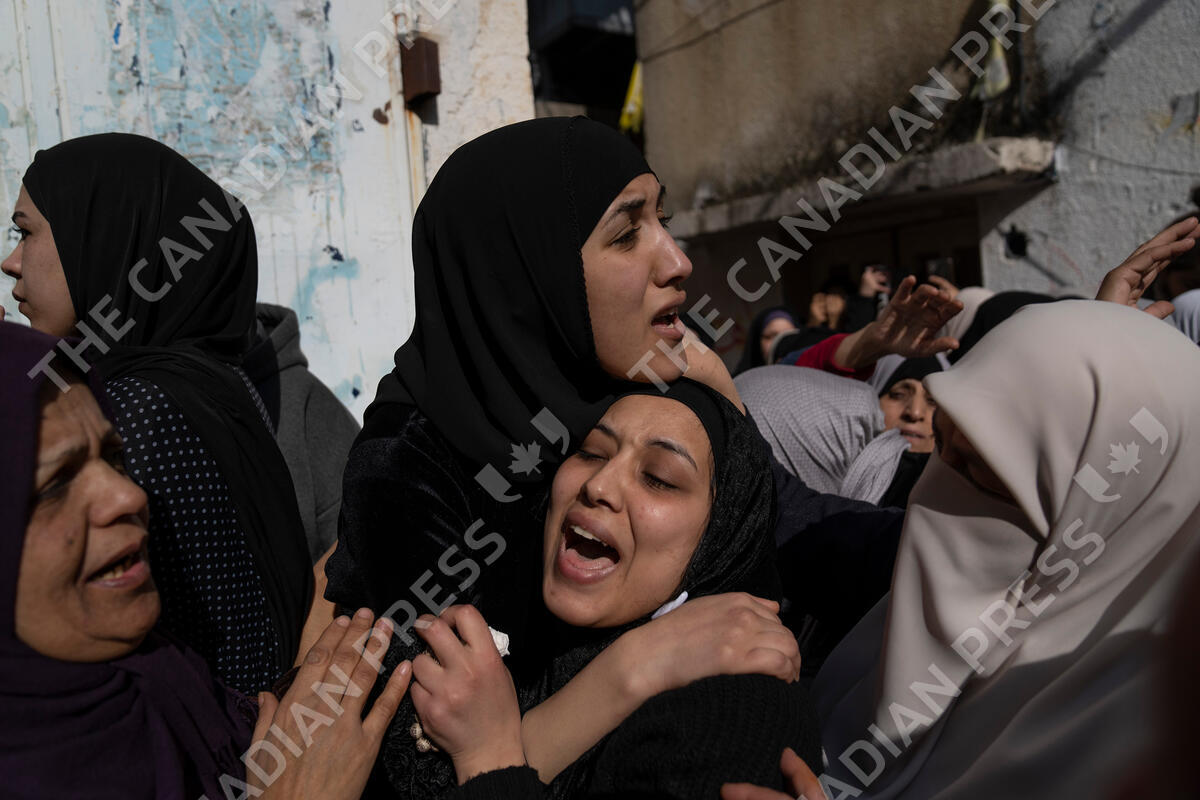 Amal and Amani Abu Junaid sisters of Ahmed Abu Junaid, 21 cry during his funeral in the West Bank refugee camp of Balata, Nablus, Thursday, Jan. 12, 2023. During a pre dawn Israeli military incursion into the hardscrabble Balata refugee camp, Israeli forces shot Abu Junaid in the head and he died several hours later, the Palestinian Health Ministry said. (AP Photo/Nasser Nasser)