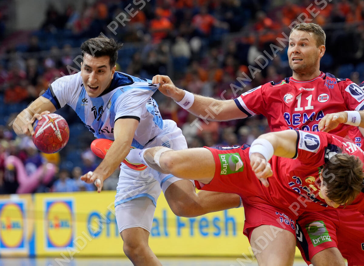 Norway's Petter Overby, right, tries to block a shot of Argentina's Pedro Martinez Cami during the group F, Handball World Championship match between Norway and Argentina in Krakow, Poland, Sunday, Jan. 15, 2023. (AP Photo/Piotr Hawalej)