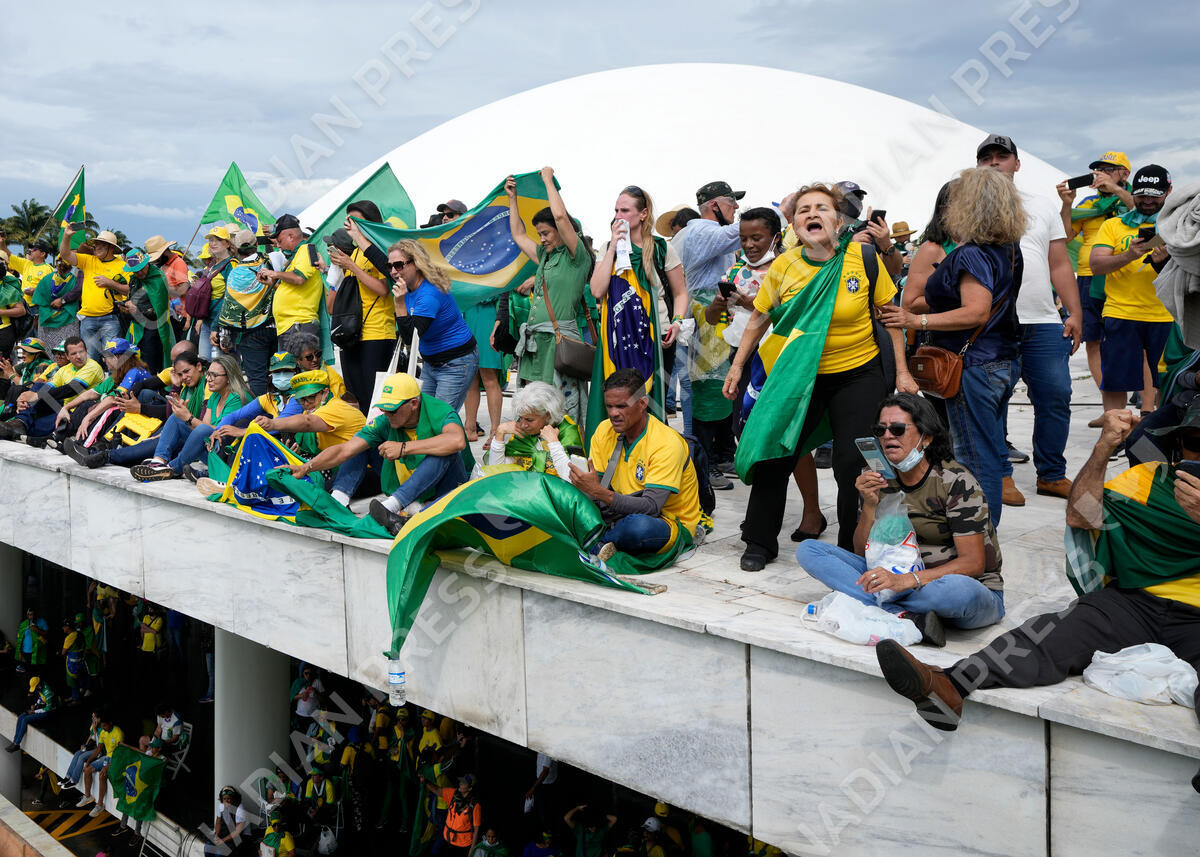 Protesters, supporters of Brazil's former President Jair Bolsonaro, stand on the roof of the National Congress building after they stormed it, in Brasilia, Brazil, Sunday, Jan. 8, 2023. (AP Photo/Eraldo Peres)