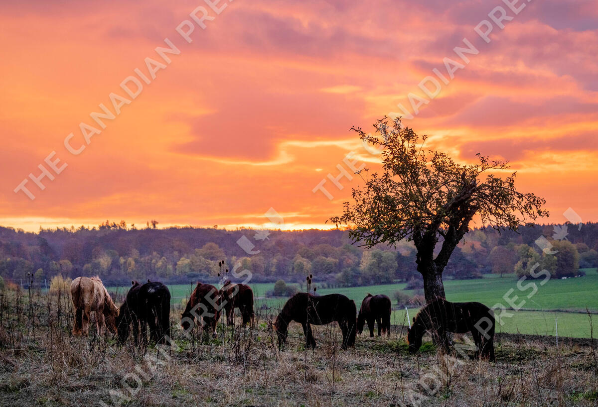 Icelandic horses graze on a meadow outside the village of Wehrheim near Frankfurt, Germany, before sunrise on Tuesday, Nov. 15, 2022. (AP Photo/Michael Probst)