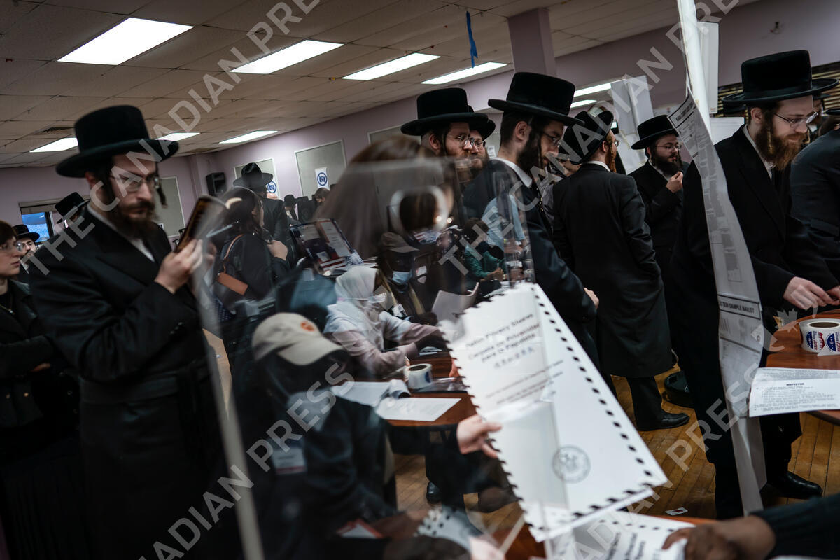 Poll workers are seen in a reflection while members of the Orthodox Jewish community register to collect ballot papers at a polling center in the Brooklyn borough of New York on Election Day, Tuesday, Nov. 8, 2022. (AP Photo/Wong Maye-E)