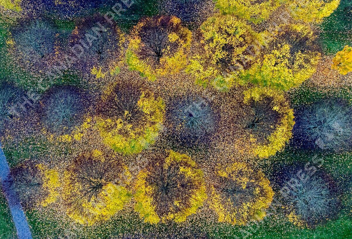 Trees that lost their leaves are seen from above in Frankfurt, Germany, Wednesday, Nov. 16, 2022. (AP Photo/Michael Probst)