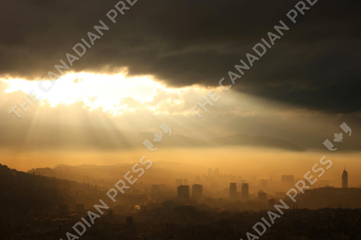 General view of the city during a sunset as smog covers Sarajevo, Bosnia, Monday, Nov. 14, 2022. (AP Photo/Armin Durgut)