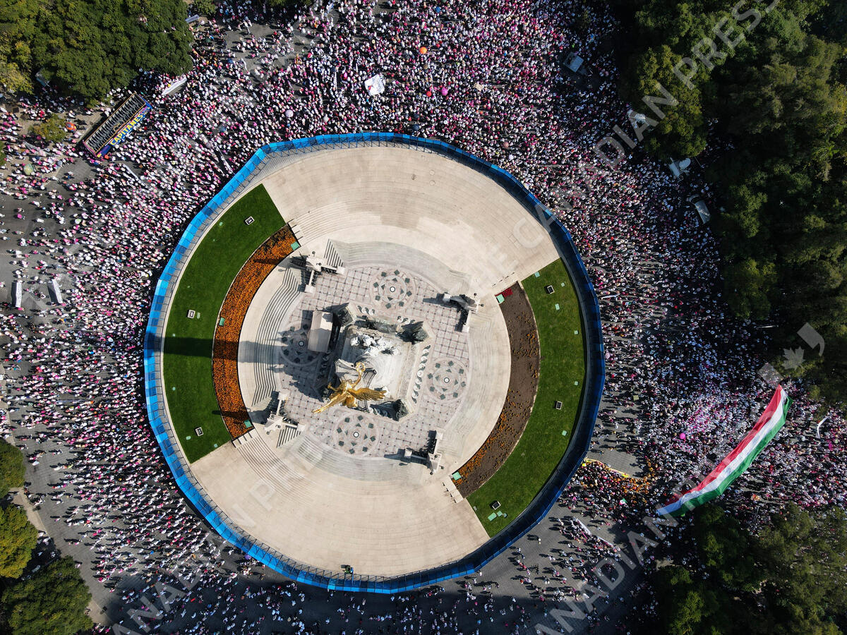 Citizen organizations rally at Mexico City's iconic "Angel of Independence" monument in support of Mexico's National Elections Institute as President Andrés Manuel Lopez Obrador pushes to overhaul it, Sunday, Nov. 13, 2022. (AP Photo/Marco Ugarte)