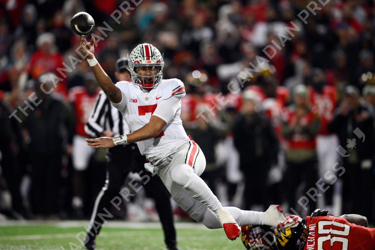 Ohio State quarterback C.J. Stroud (7) throws the ball away during the second half of an NCAA college football game against Maryland, Saturday, Nov. 19, 2022, in College Park, Md. Ohio State won 43-30. (AP Photo/Nick Wass)
