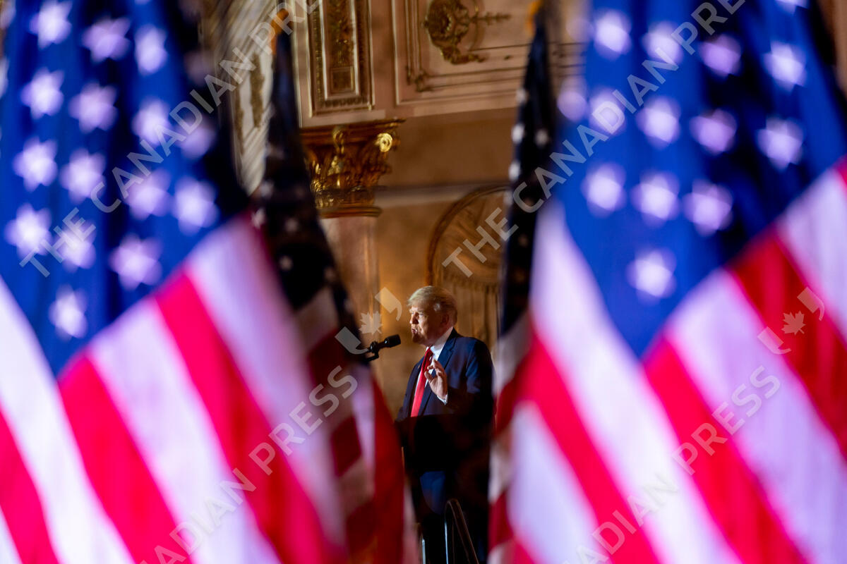 Former President Donald Trump, seen in reflection, announces he is running for president for the third time as he speaks at Mar-a-Lago in Palm Beach, Fla., Tuesday, Nov. 15, 2022. (AP Photo/Andrew Harnik)