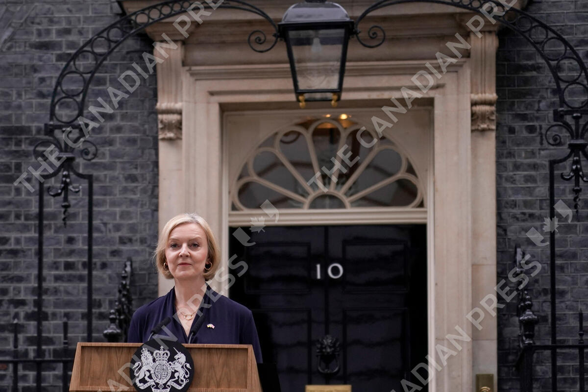 Britain's Prime Minister Liz Truss addresses the media in Downing Street in London, Thursday, Oct. 20, 2022. Truss says she resigns as leader of UK Conservative Party. (AP Photo/Alberto Pezzali)