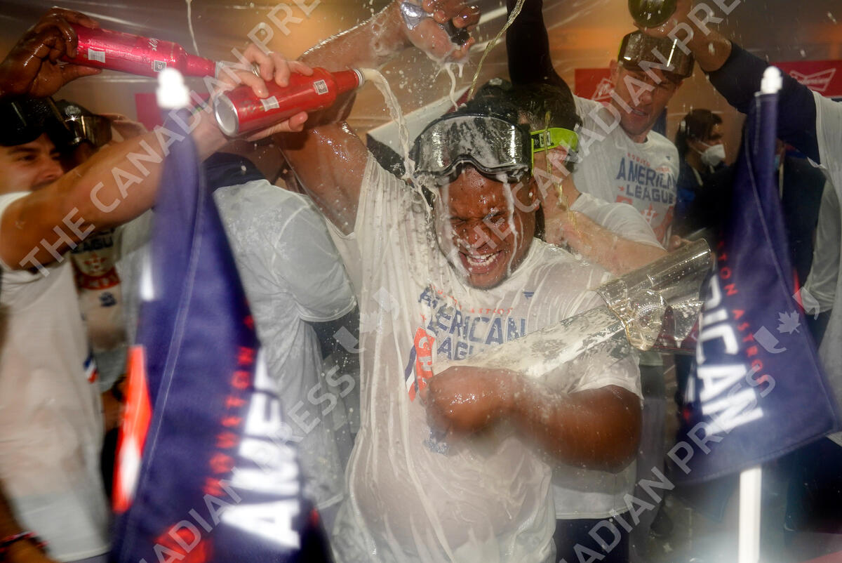 The Houston Astros celebrate in the locker room after defeating the New York Yankees in Game 4 to win the American League Championship baseball series, Monday, Oct. 24, 2022, in New York. (AP Photo/Seth Wenig)