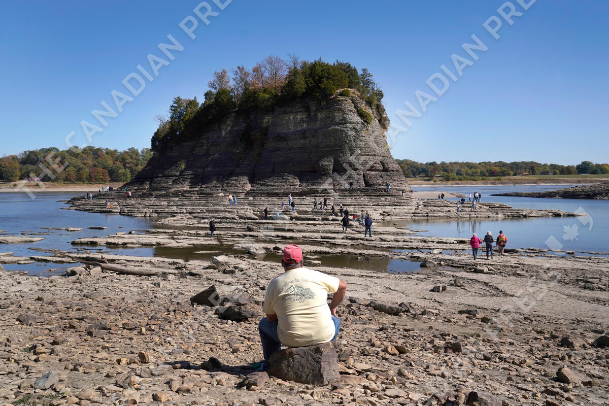Randy Statler, of Old Appleton, Mo., sits on a rock as he watches as people walk to Tower Rock, an attraction normally surrounded by the Mississippi River and only accessible by boat, Wednesday, Oct. 19, 2022, in Perry County, Mo. Statler, who lives about 10 miles away, says he can only remember one other time the river was so low as to make walking to the rock formation possible. (AP Photo/Jeff Roberson)