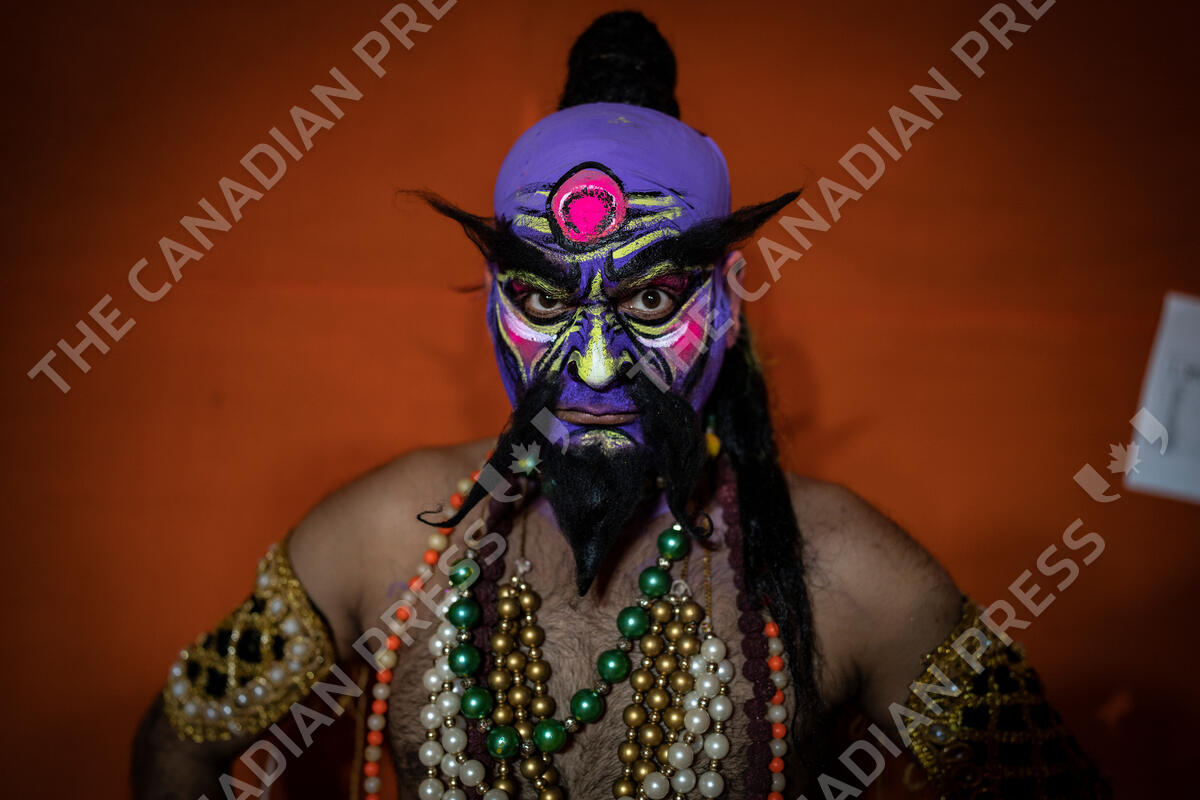 An artist dressed as a demon poses backstage before a Ramleela performance as part of Dussehra festival celebrations in New Delhi, India, Tuesday, Oct. 4, 2022. Ramleela is a dramatic folk re-enactment of the life of Hindu lord Rama. After the enactment of the legendary war between Good and Evil, the Ramleela celebrations climax in the Dussehra night festivities where the giant effigies of demon King Ravana, his brother Kumbakaran and son Meghnad are burnt, typically with fireworks. (AP Photo/Altaf Qadri)