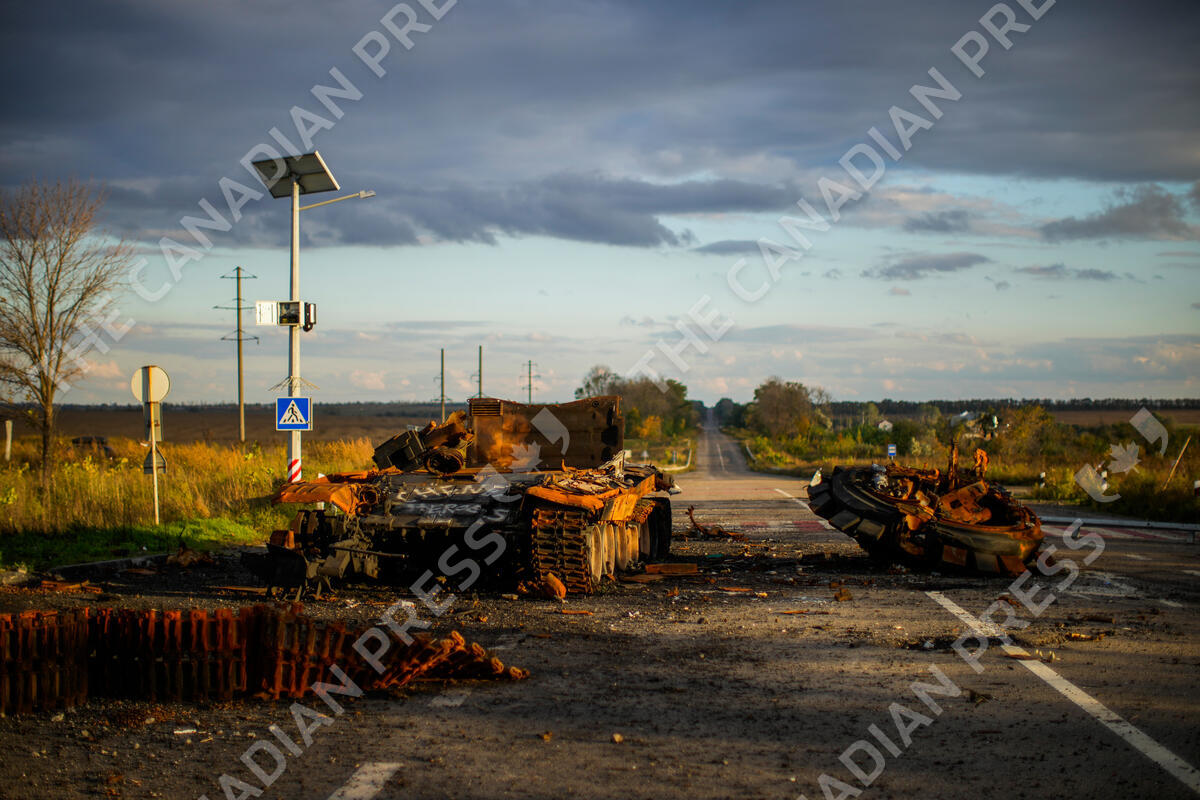Remains of a destroyed Russian tank are scattered on the ground along the road between Izium and Kharkiv, Ukraine, Monday, Oct. 3, 2022. (AP Photo/Francisco Seco)