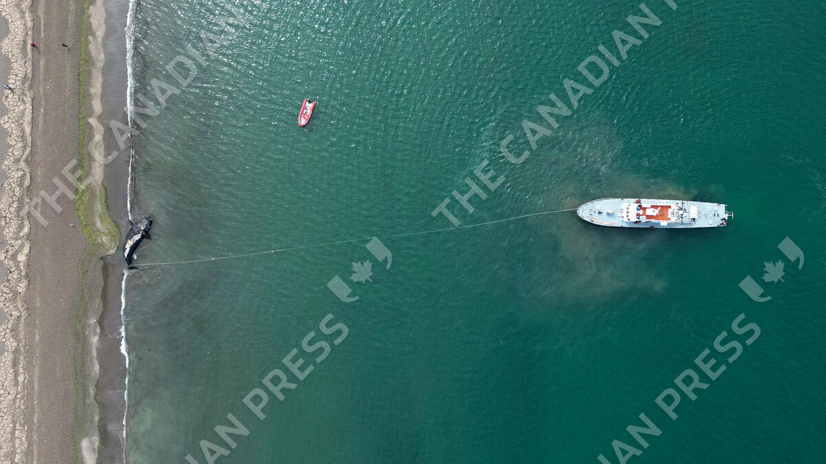 A dead whale is towed away from the shore near Puerto Madryn, Argentina, Tuesday, Oct. 4, 2022. Argentine scientists are determining the reason for at least 13 whales dying in the area in the past few days. (AP Photo/Maxi Jonas)