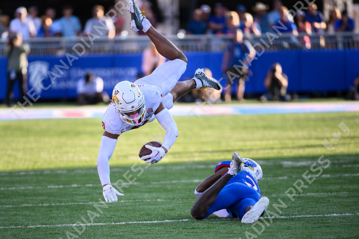 Iowa State wide receiver Xavier Hutchinson (8) is upended by Kansas cornerback Cobee Bryant (2) during the second half of an NCAA college football game, Saturday, Oct. 1, 2022, in Lawrence, Kan. (AP Photo/Reed Hoffmann)