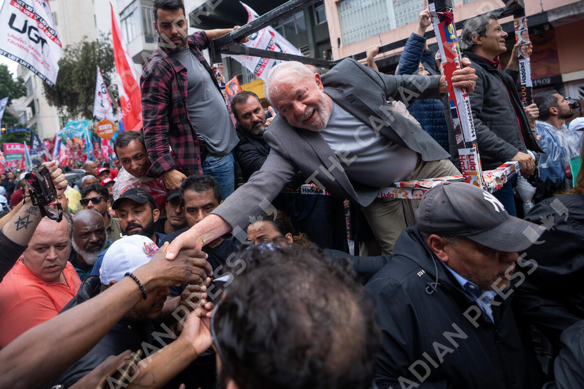 Brazil's former President Luiz Inacio Lula da Silva, who is running for president, shakes hands with a supporter as he campaigns a day ahead of the country's general election, in Sao Paulo, Brazil, Saturday, Oct. 1, 2022. (AP Photo/Victor R. Caivano)