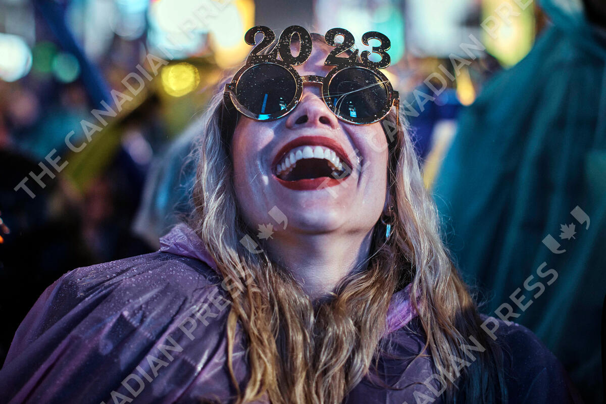 A reveler laughs as she waits for the countdown during the New Year's Eve celebrations in Times Square, late Saturday, Dec. 31, 2022, in New York. (AP Photo/Andres Kudacki)