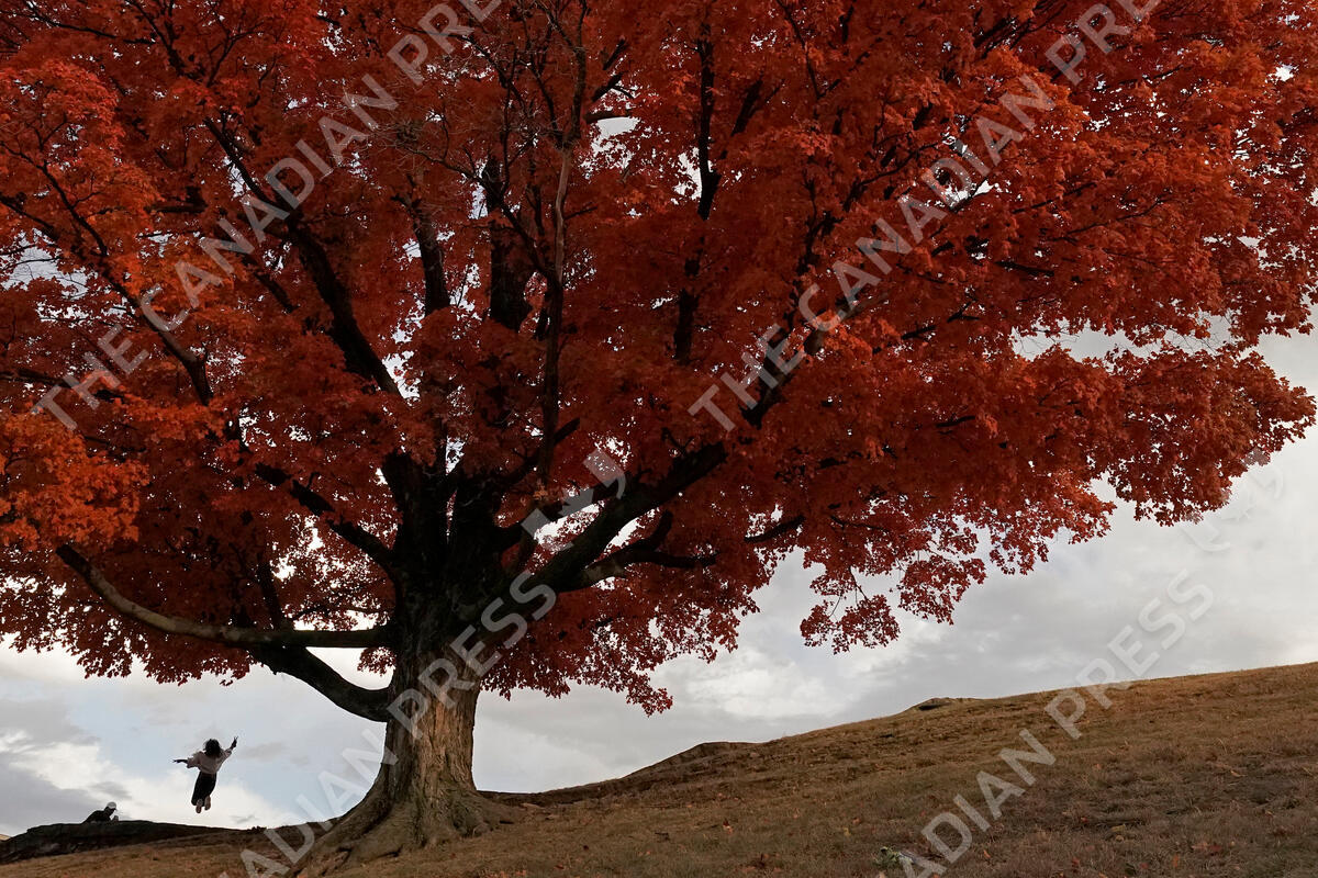 A woman jumps in the air for a photo in front of a maple tree in full fall color in Kansas City, Mo., on Sunday, Oct. 23, 2022. (AP Photo/Charlie Riedel)