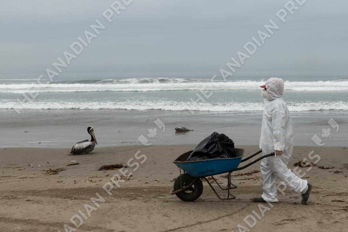 A municipal worker pushes dead pelicans in a wheelbarrow on Santa Maria beach in Lima, Peru, Tuesday, Nov. 29, 2022. At least 13,000 pelicans have died so far in November along the Pacific of Peru from bird flu, according to The National Forest and Wildlife Service (Serfor) on Tuesday. (AP Photo/Guadalupe Pardo)