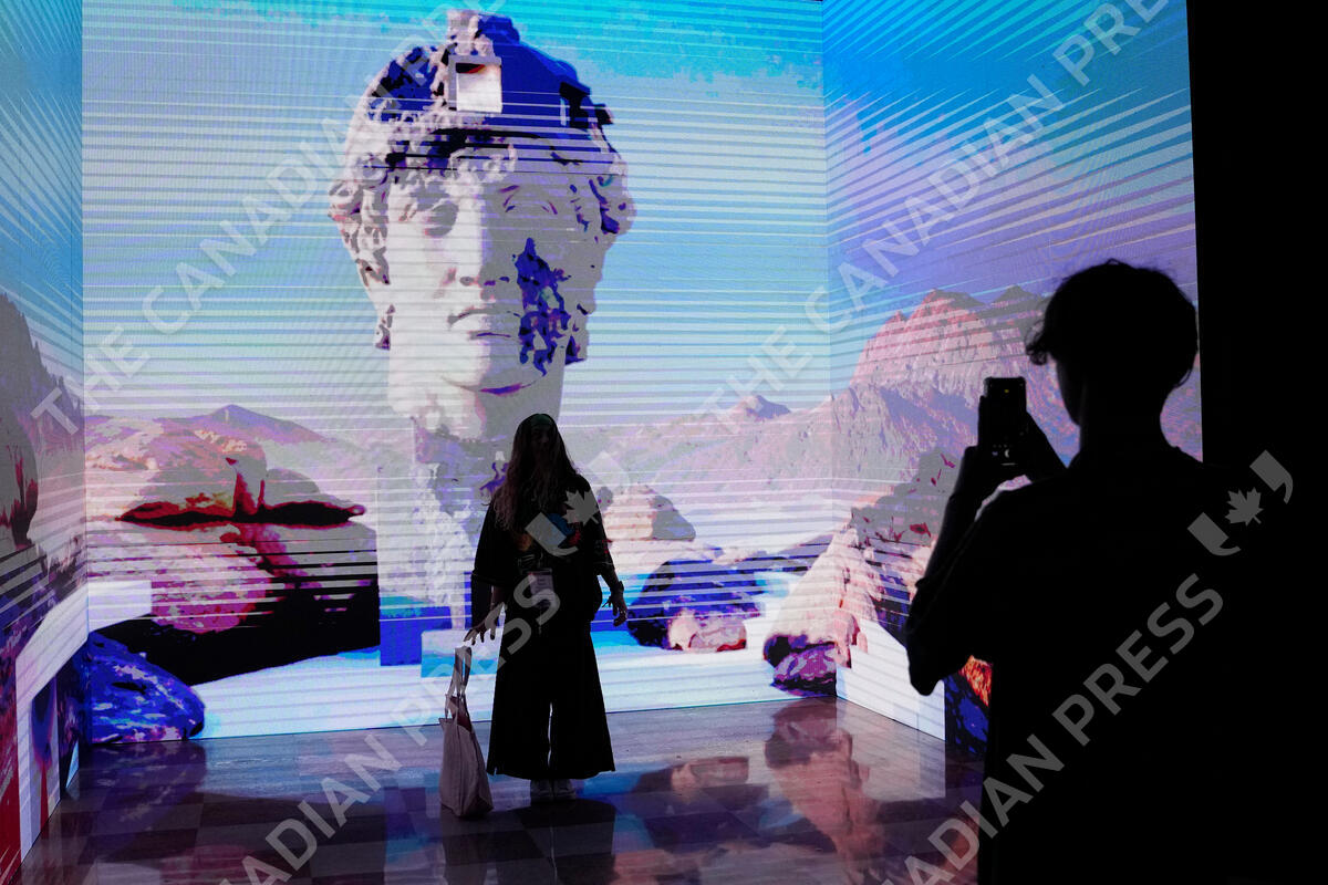 A woman poses for a photograph during a NFT event called The Gateway: A Web3 Metropolis during Miami Art Week, Wednesday, Nov. 30, 2022, in Miami. The NFT by artist Daniel Arsham titled Ares House, features a virtual home inside the Greek God Ares, designed for The Row. (AP Photo/Lynne Sladky)