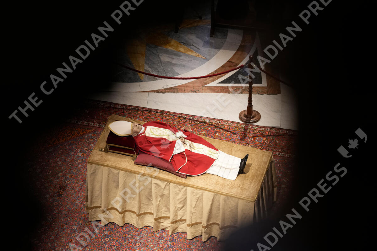 The body of late Pope Emeritus Benedict XVI is lied out in state inside St. Peter's Basilica at The Vatican, Tuesday, Jan. 3, 2023. Pope Benedict, the German theologian who will be remembered as the first pope in 600 years to resign, has died, the Vatican announced Saturday, Dec. 31, 2022. He was 95. (AP Photo/Andrew Medichini)