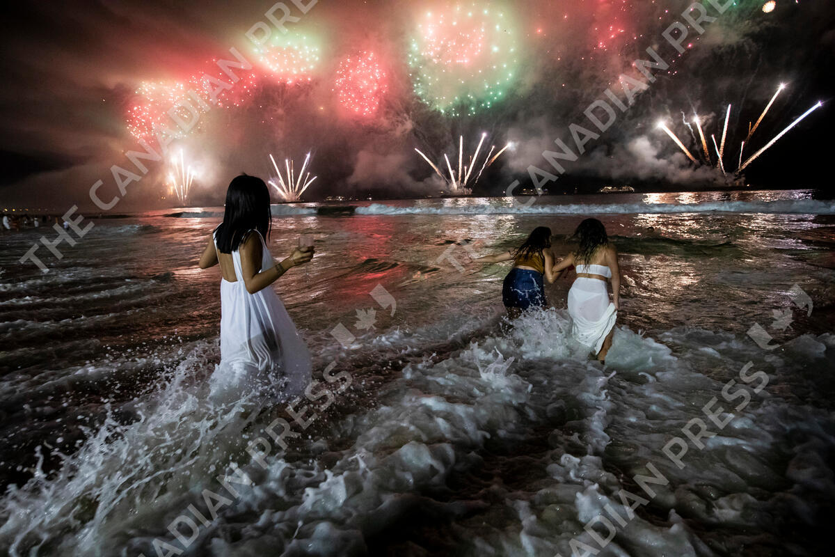 People bring in the New Year as they watch fireworks explode over Copacabana Beach in Rio de Janeiro, Brazil, early Sunday, Jan. 1, 2023. (AP Photo/Bruna Prado)
