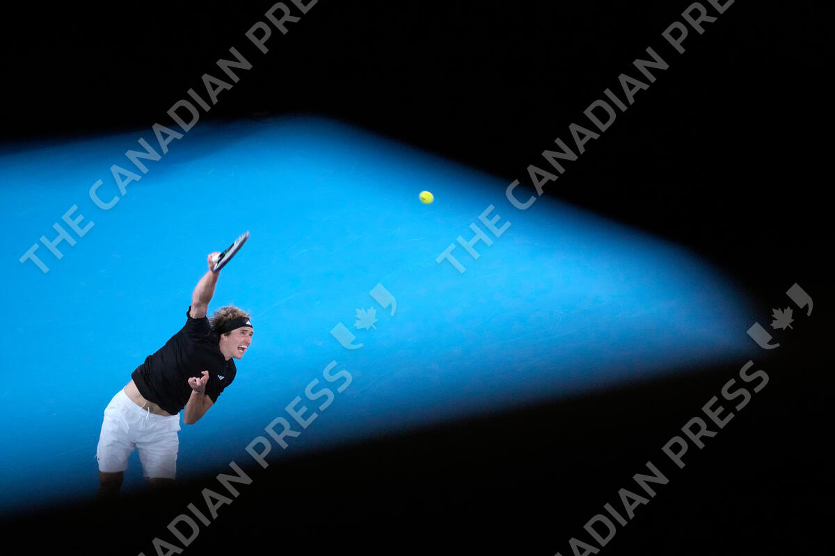 Alexander Zverev of Germany serves to Juan Pablo Varillas of Peru during their first round match at the Australian Open tennis championship in Melbourne, Australia, Tuesday, Jan. 17, 2023. (AP Photo/Dita Alangkara)