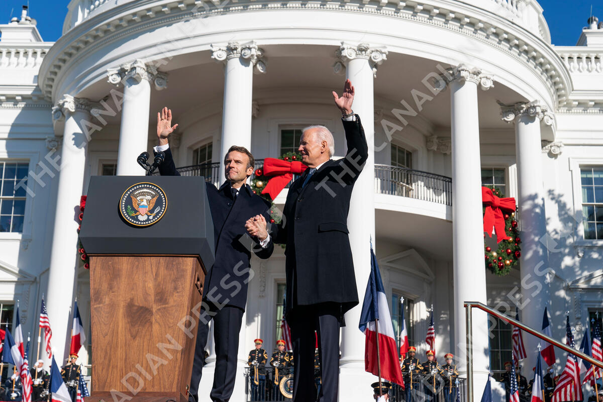 French President Emmanuel Macron, left, and President Joe Biden wave during a State Arrival Ceremony on the South Lawn of the White House in Washington, Thursday, Dec. 1, 2022. (AP Photo/Alex Brandon)