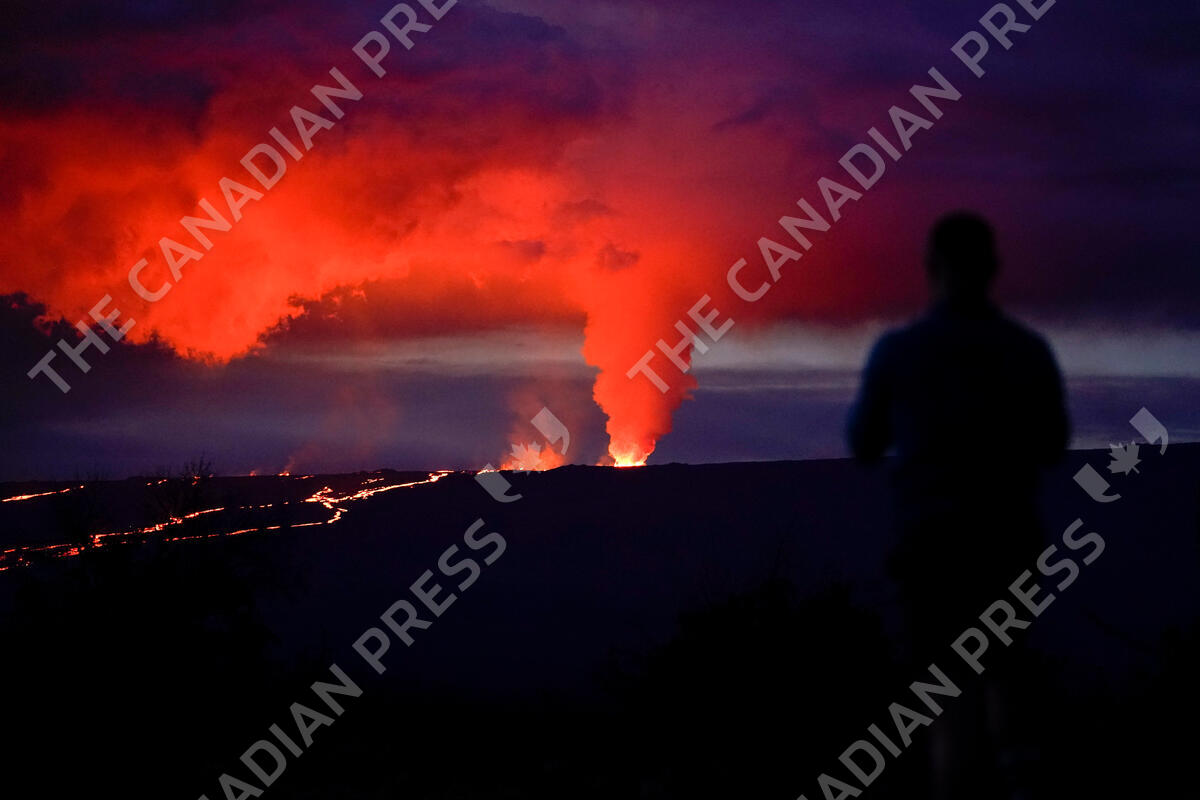 A man watches as lava erupts from Hawaii's Mauna Loa volcano Wednesday, Nov. 30, 2022, near Hilo, Hawaii. (AP Photo/Gregory Bull)