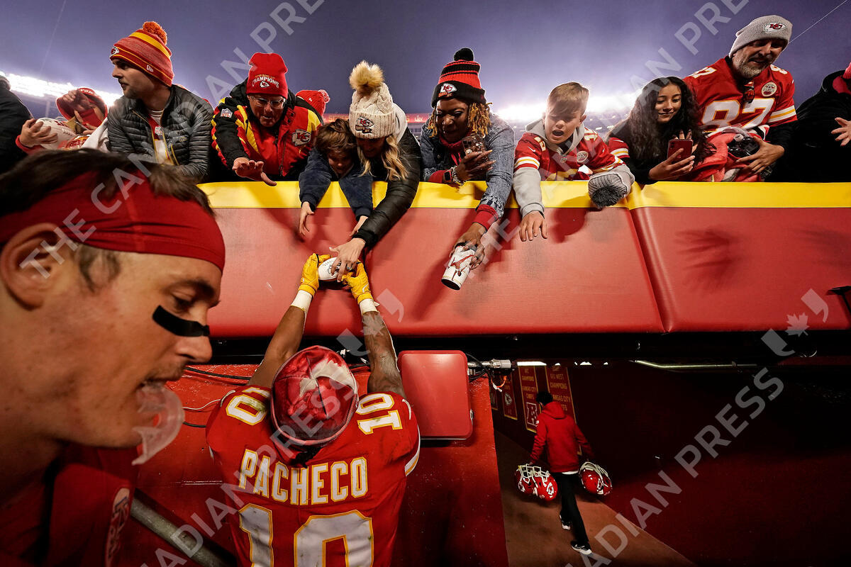 Kansas City Chiefs running back Isiah Pacheco (10) signs autographs after an NFL football game against the Los Angeles Rams Sunday, Nov. 27, 2022, in Kansas City, Mo. Kansas City won 26-10. (AP Photo/Charlie Riedel)