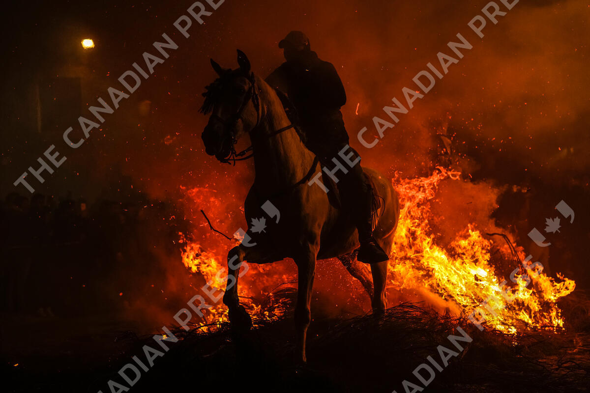 A man rides a horse through a bonfire as part of a ritual in honor of Saint Anthony the Abbot, the patron saint of domestic animals, in San Bartolome de Pinares, Spain, Monday, Jan. 16, 2023. On the eve of Saint Anthony's Day, dozens ride their horses through the narrow cobblestone streets of the small village of San Bartolome during the "Luminarias," a tradition that dates back 500 years and is meant to purify the animals with the smoke of the bonfires and protect them for the year to come. (AP Photo/Manu Fernandez)