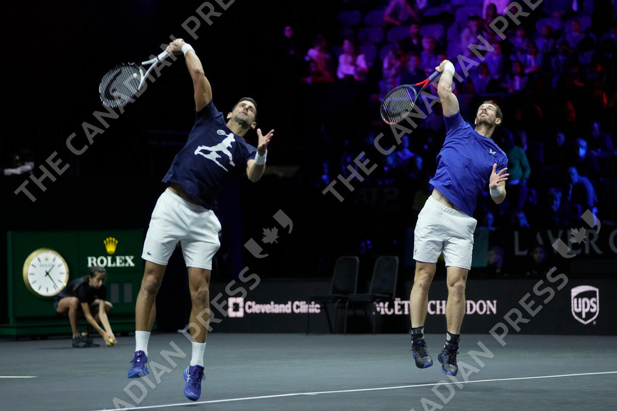 Britain's Andy Murray, right, and Serbia's Novak Djokovic attend a training session ahead of the Laver Cup tennis tournament at the O2 in London, Thursday, Sept. 22, 2022. (AP Photo/Kin Cheung)