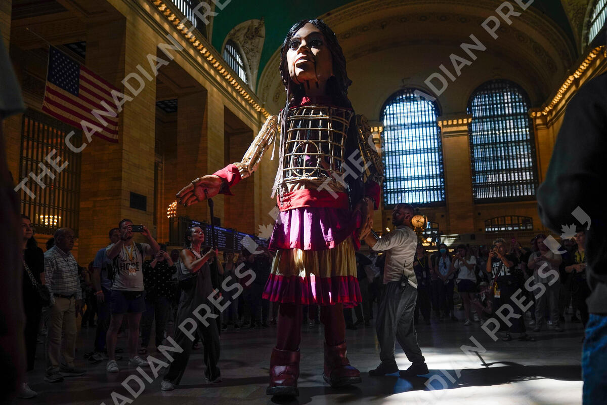 A large puppet named Little Amal walks around Grand Central Station in New York, Thursday, Sept. 15, 2022. New York City's latest celebrity visitor is stopping traffic even in this jaded, larger-than-life town. Little Amal, a 12-foot puppet of a 10-year-old Syrian refugee, is on a 17-day blitz through every corner of the Big Apple as part of a theater project hoping to raise awareness about immigration. (AP Photo/Seth Wenig)