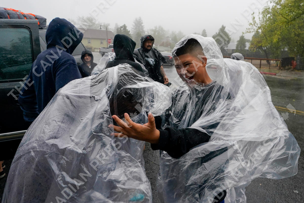 Members of the Ornelas family put on plastic raincoats as wind and rain pummel the area Friday, Sept. 9, 2022, in Julian, Calif. A tropical storm nearing Southern California has brought fierce mountain winds, high humidity, rain and the threat of flooding to a region already dealing with wildfires and an extraordinary heat wave. (AP Photo/Gregory Bull)