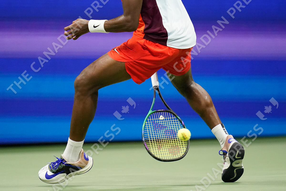 Frances Tiafoe of the United States returns a shot between his legs to Carlos Alcaraz of Spain during the semifinals of the U.S. Open tennis championships, Friday, Sept. 9, 2022, in New York. (AP Photo/Charles Krupa)