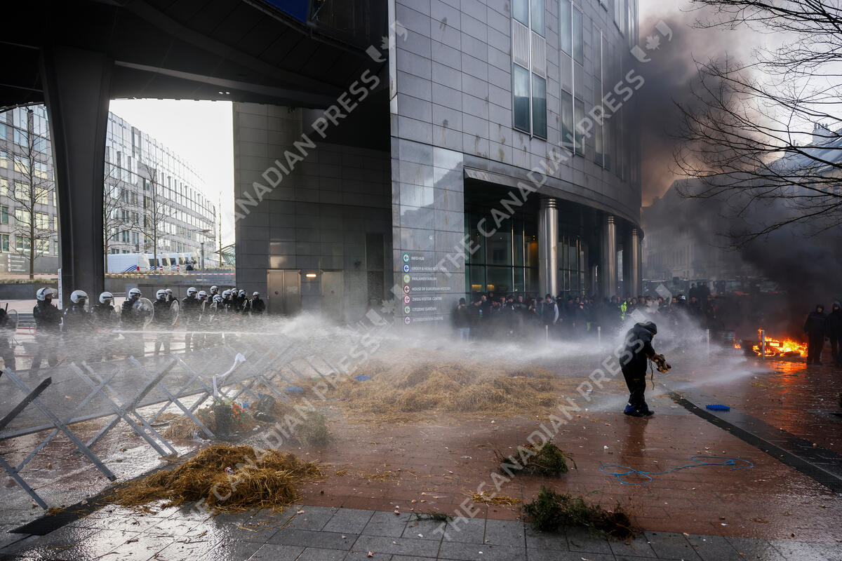 Anti riot police use water to disperse people during a protest by farmers outside the European Parliament as European leaders meet for an EU summit in Brussels, Thursday, Feb. 1, 2024. European Union leaders meet in Brussels for a one day summit to discuss the revision of the Multiannual Financial Framework 2021-2027, including support for Ukraine. (AP Photo/Thomas Padilla)