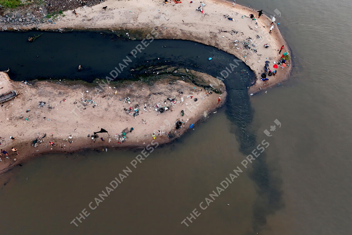 People fish next to drainage that flows into the Paraguay River in Asuncion, Paraguay, Sunday, Jan. 28, 2024. (AP Photo/Jorge Saenz)
