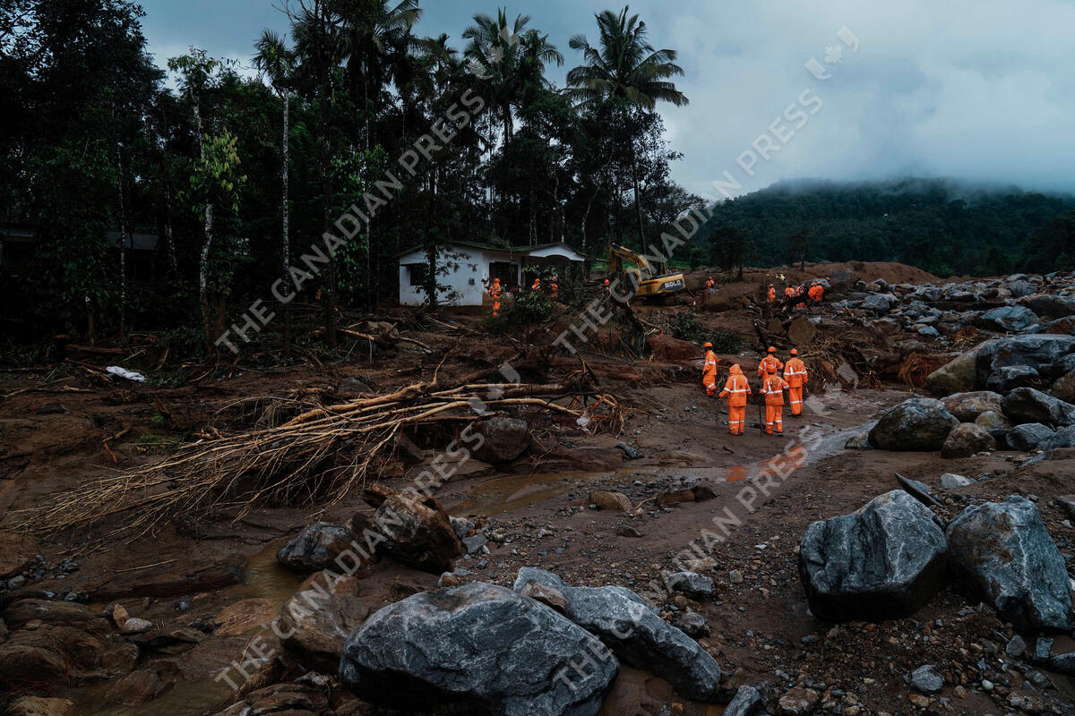 Rescuers search through mud and debris for a third day after landslides set off by torrential rains in Wayanad district, Kerala state, India, Thursday, Aug. 1, 2024. (AP Photo/Rafiq Maqbool)